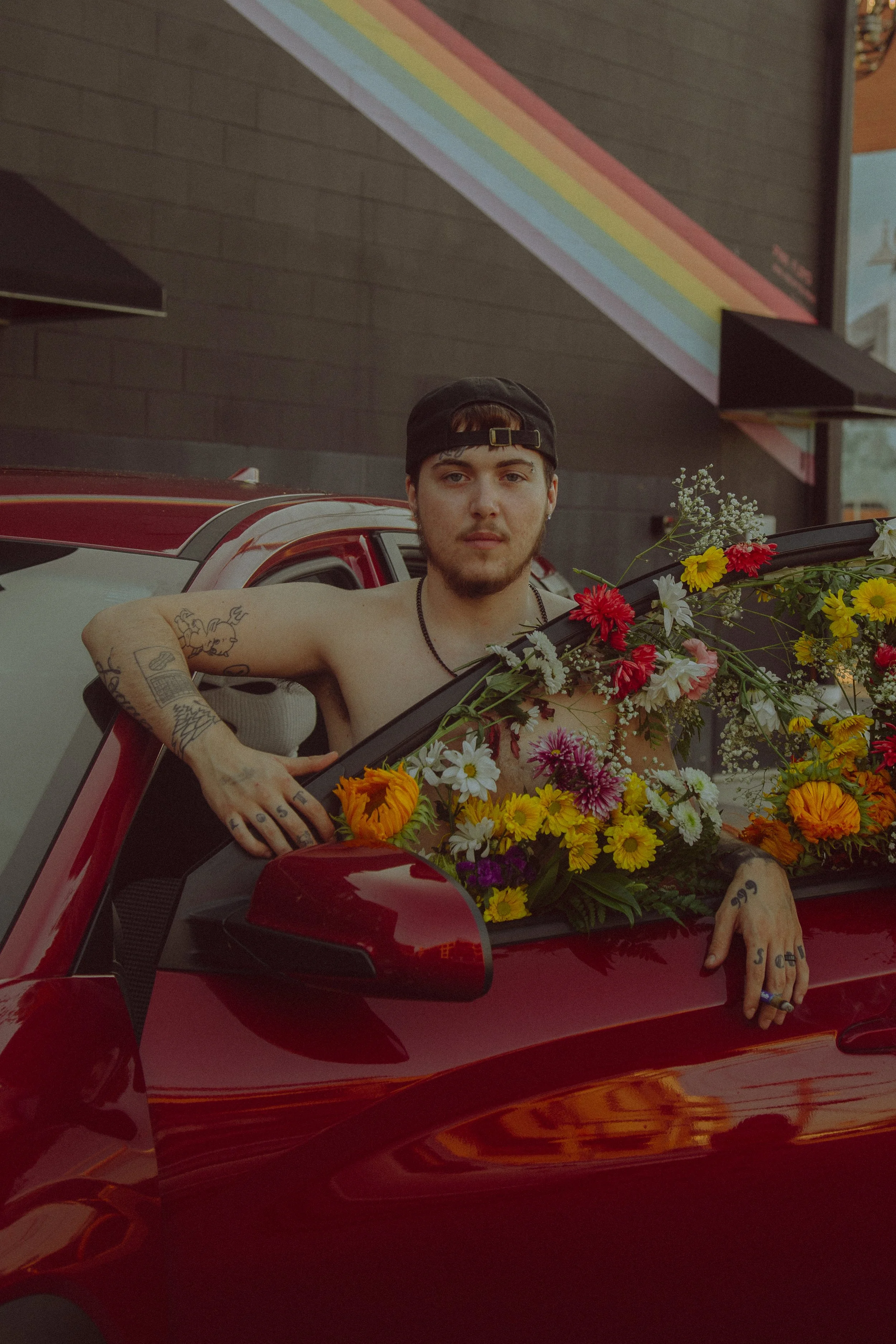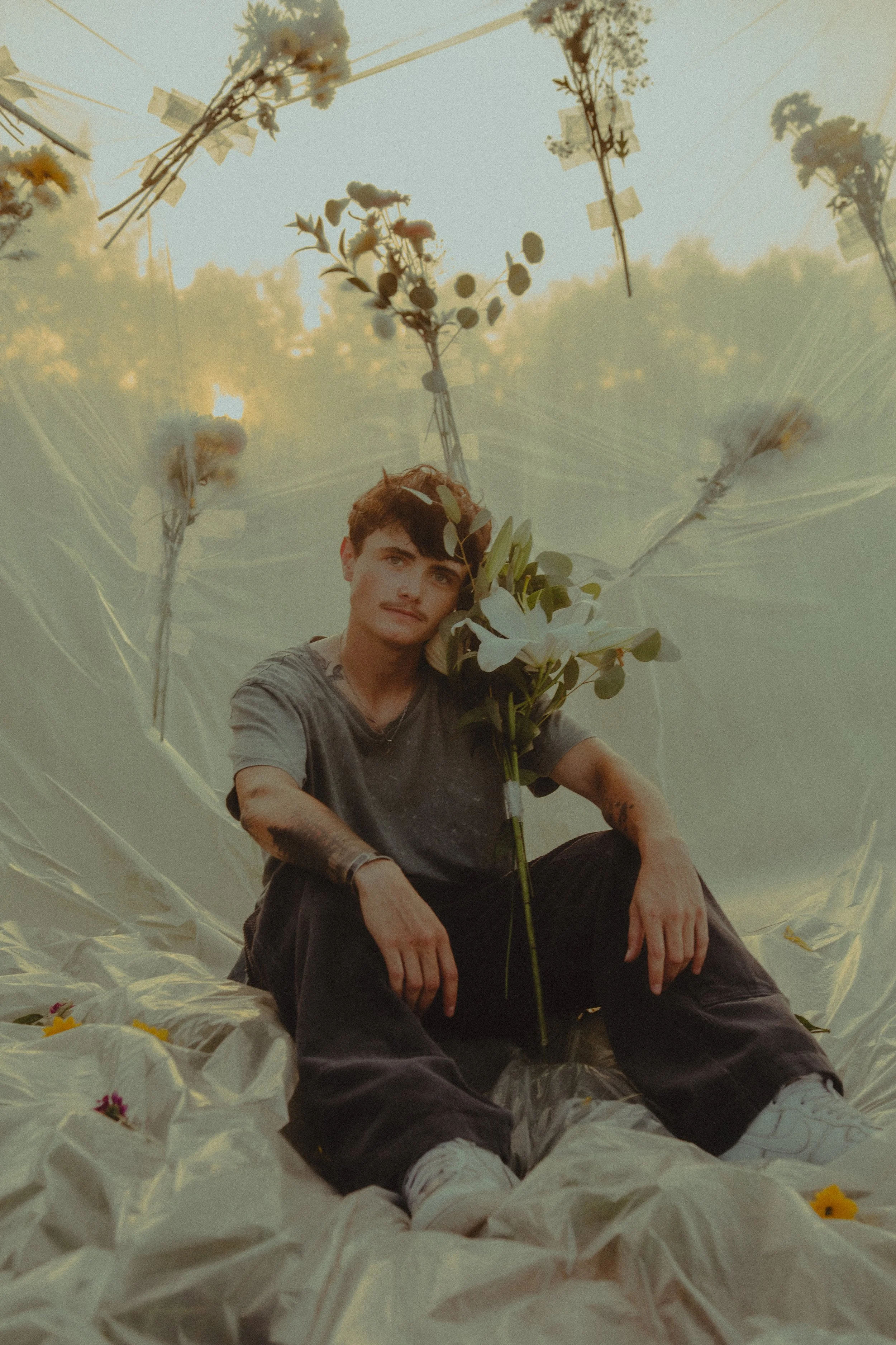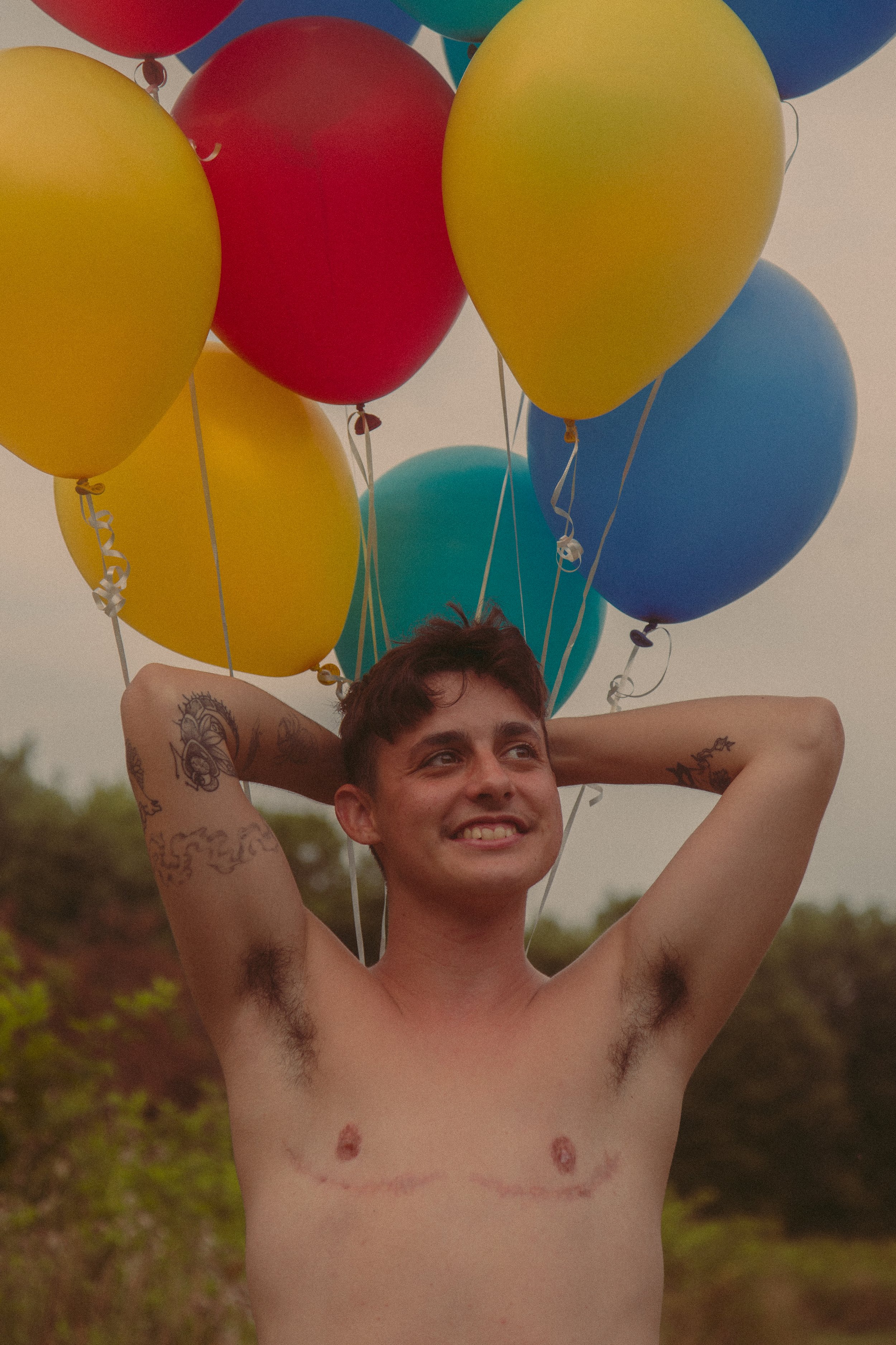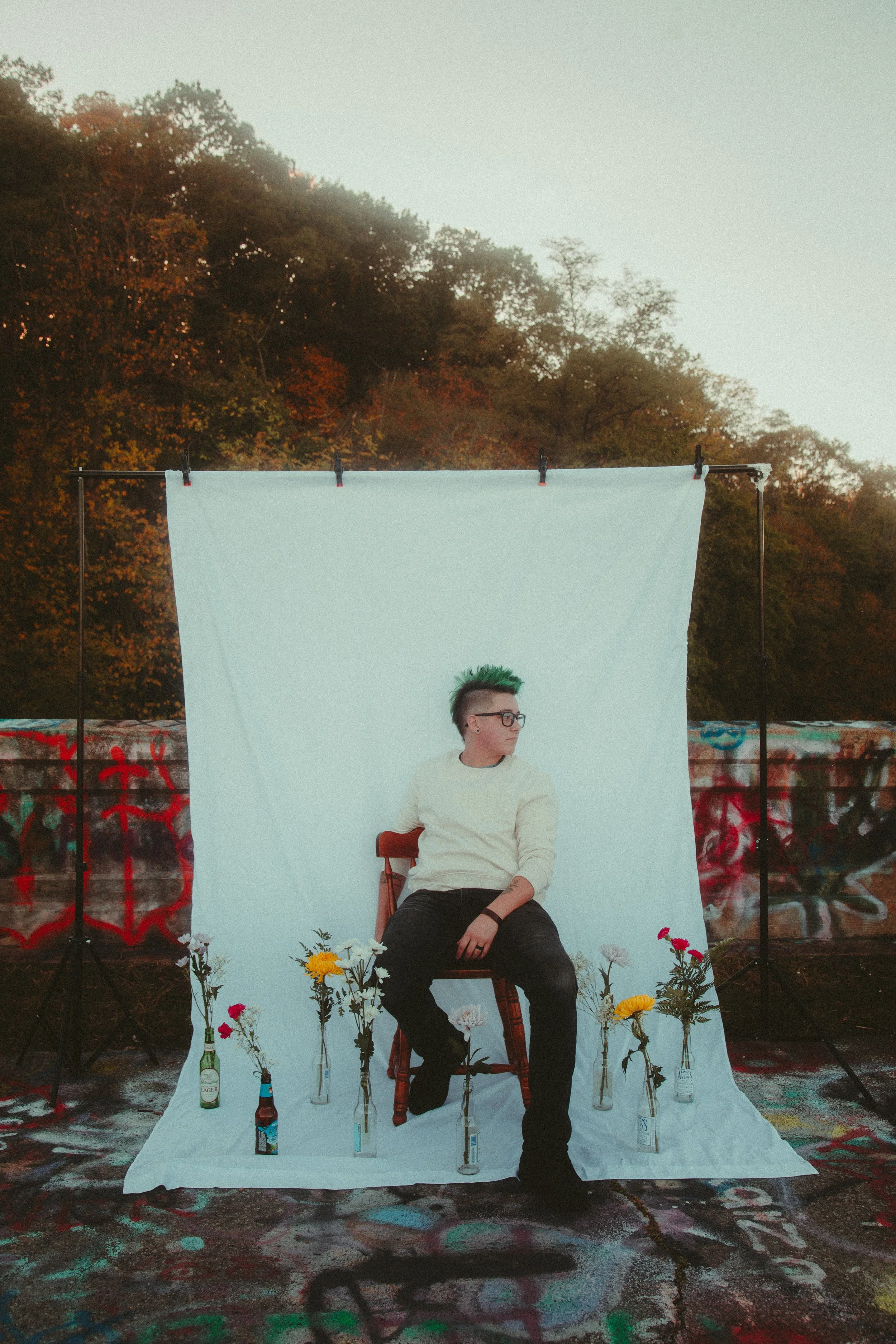 2 years ago I was finally able to get the surgery that I needed to finally feel comfortable in my body. Top surgery was a need for me and I wanted to do a shoot to talk about the scars of top surgery and loving your body after. I don’t like to talk much about my personal feelings about my experience so I do it through my art. I wanted this photoshoot to bring beauty to the trans body. My girlfriend bought me flowers for my 2 years post op today and I wanted to use them in this shoot to represent personal growth in loving your scars. Your scars are beautiful but it’s okay to take time to love them yourself.