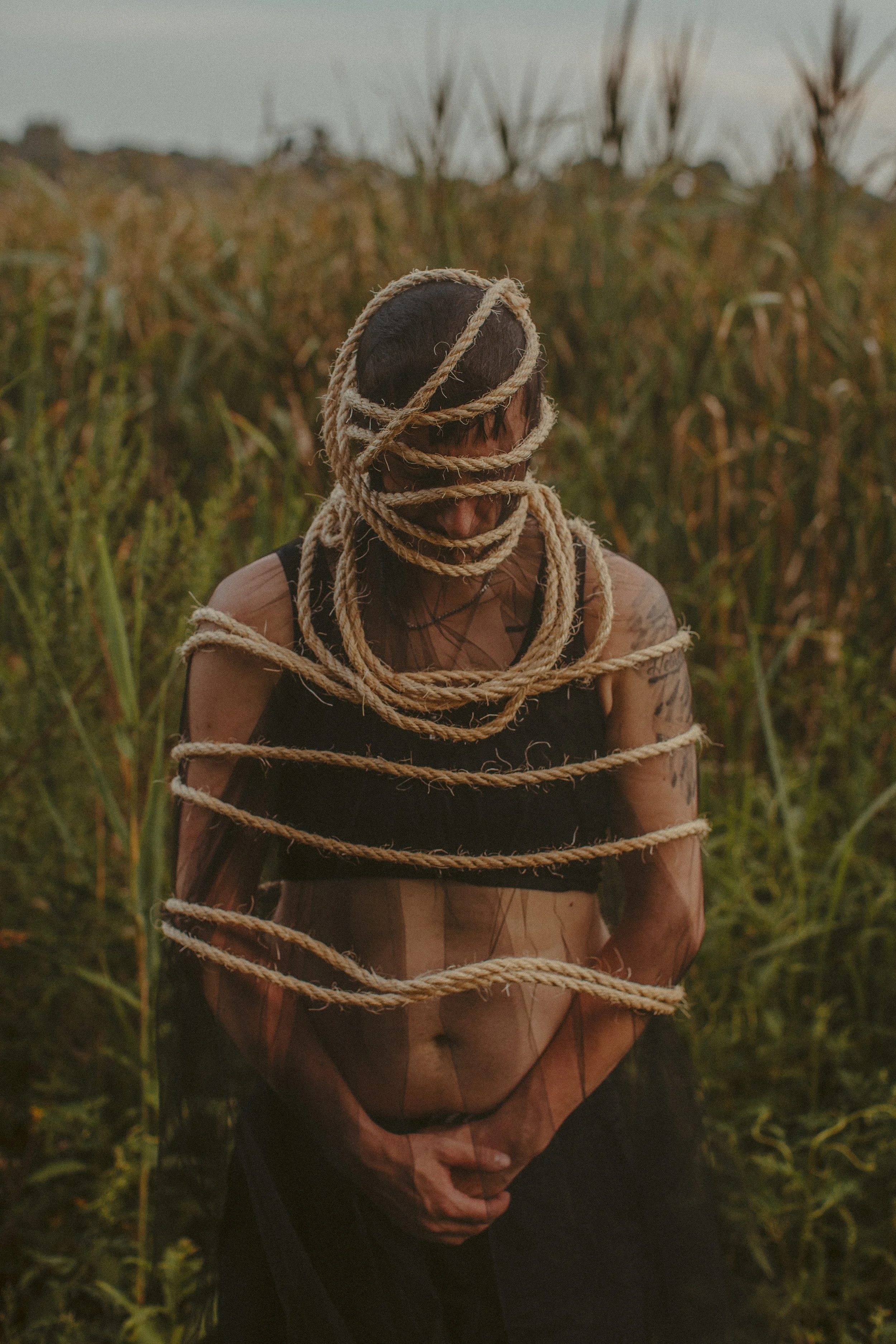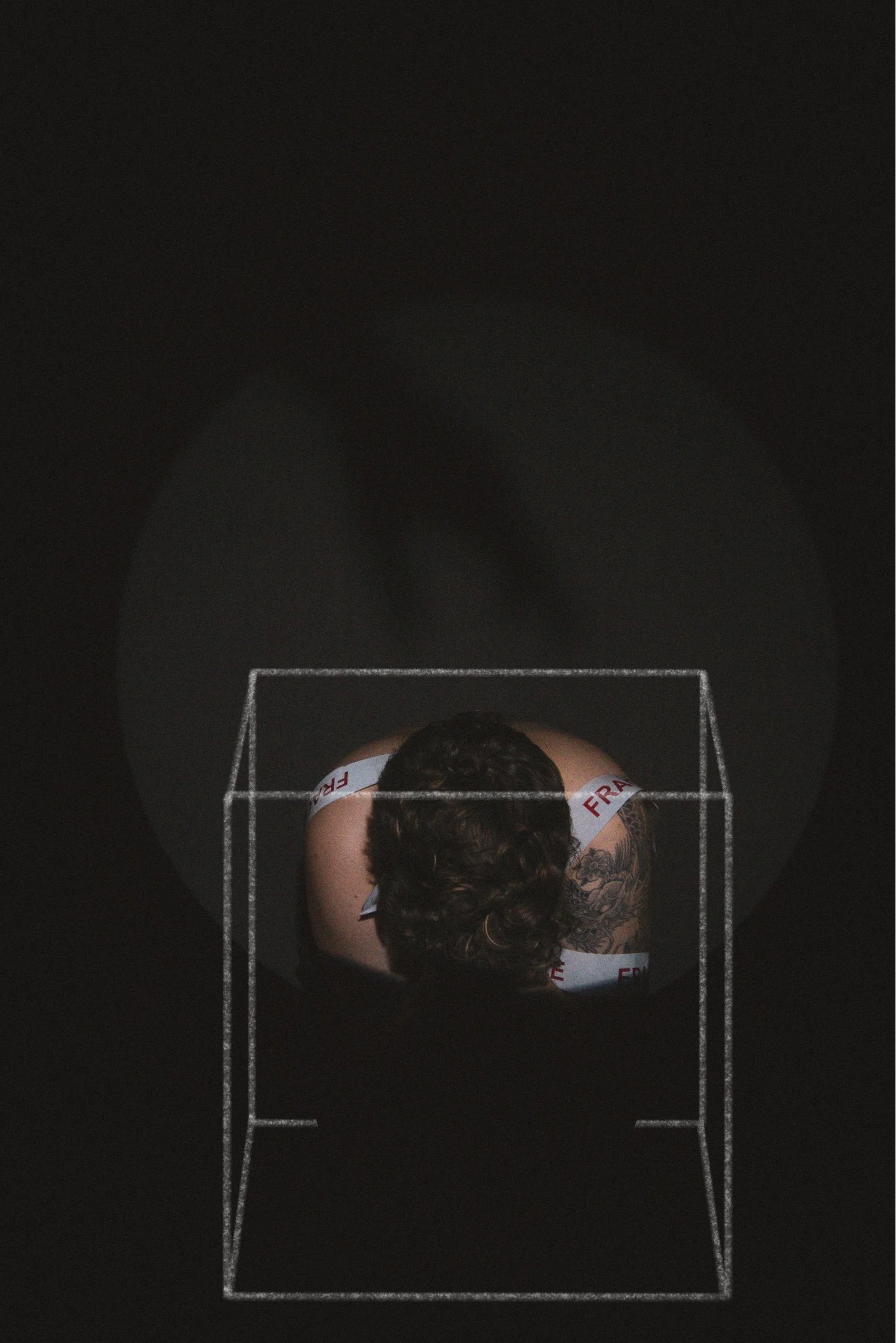 This specific piece holds a lot of meaning to me. I used to bind with KT tape to make my chest appear smaller. It became unhealthy for me to bind as much as I did but it was the only way for me to feel less dysphoric. I felt trapped. Trapped in a body that wasn't mine. Everything about the emotions that this piece exhibits surrounds my experience in my body and the mental exhaustion it took for me to bind every single day.