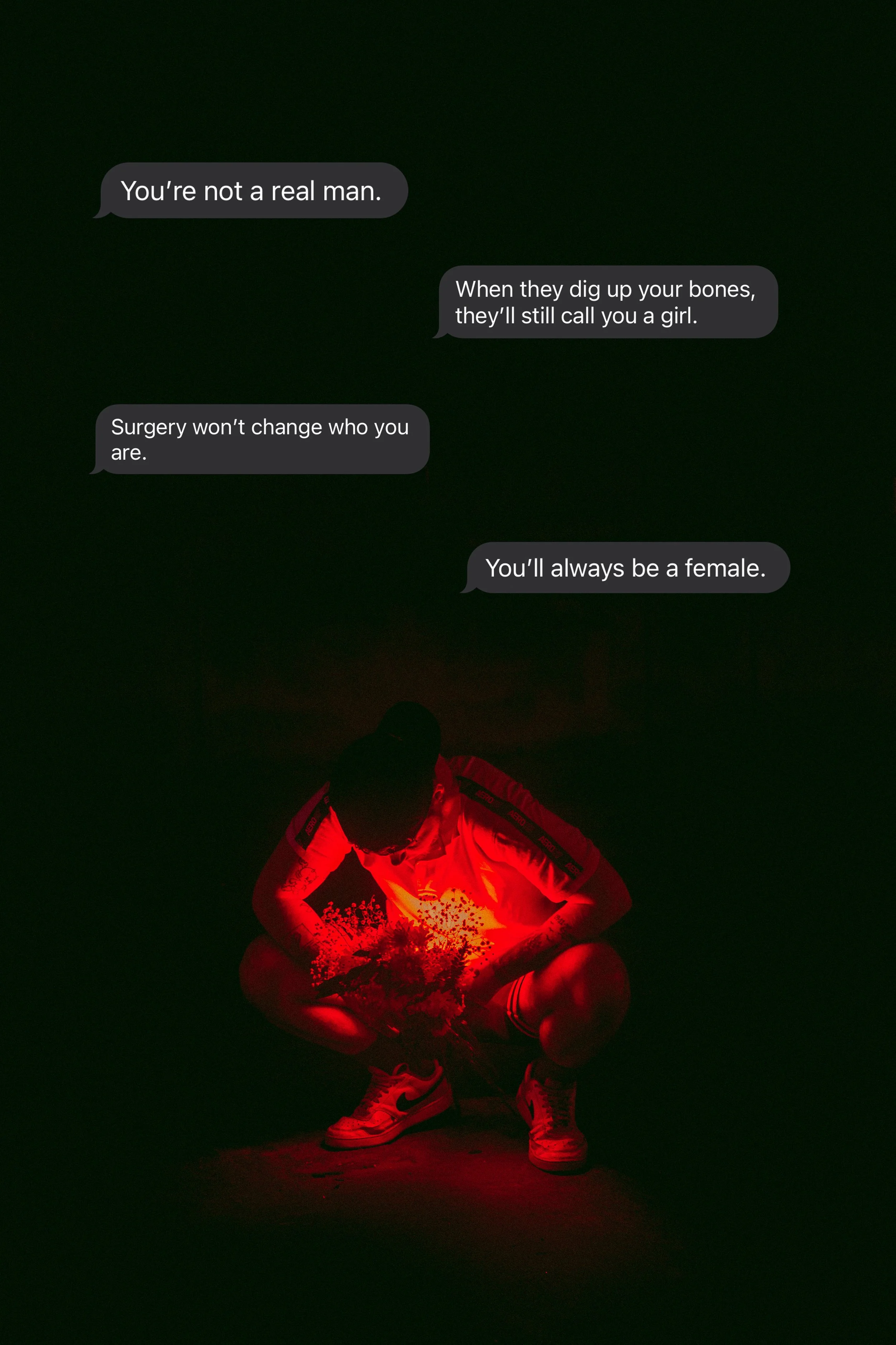 I wanted to do a photoshoot to bring attention to transphobia and homophobia online. As a way to raise awareness for the discrimination and hate that trans people face through social media I took only a few of the many hate comments iIve gotten and made them into art. I wanted this piece to create dialogue and show how vicious people can be towards the queer community over a screen.