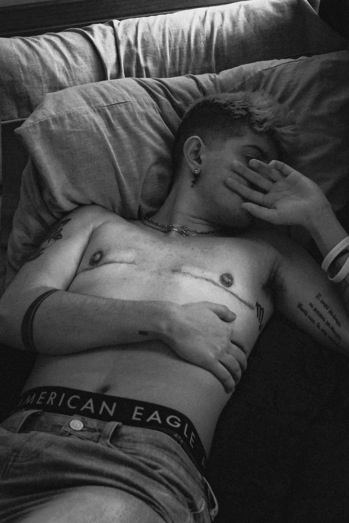 This specific shot holds a lot of meaning to me. I did this shoot a day before my top surgery. My chest dysphoria has probably been one of the hardest things to deal with. Looking down everyday when you wake up and being reminded that you are still stuck in a body that isn’t yours was excruciating.